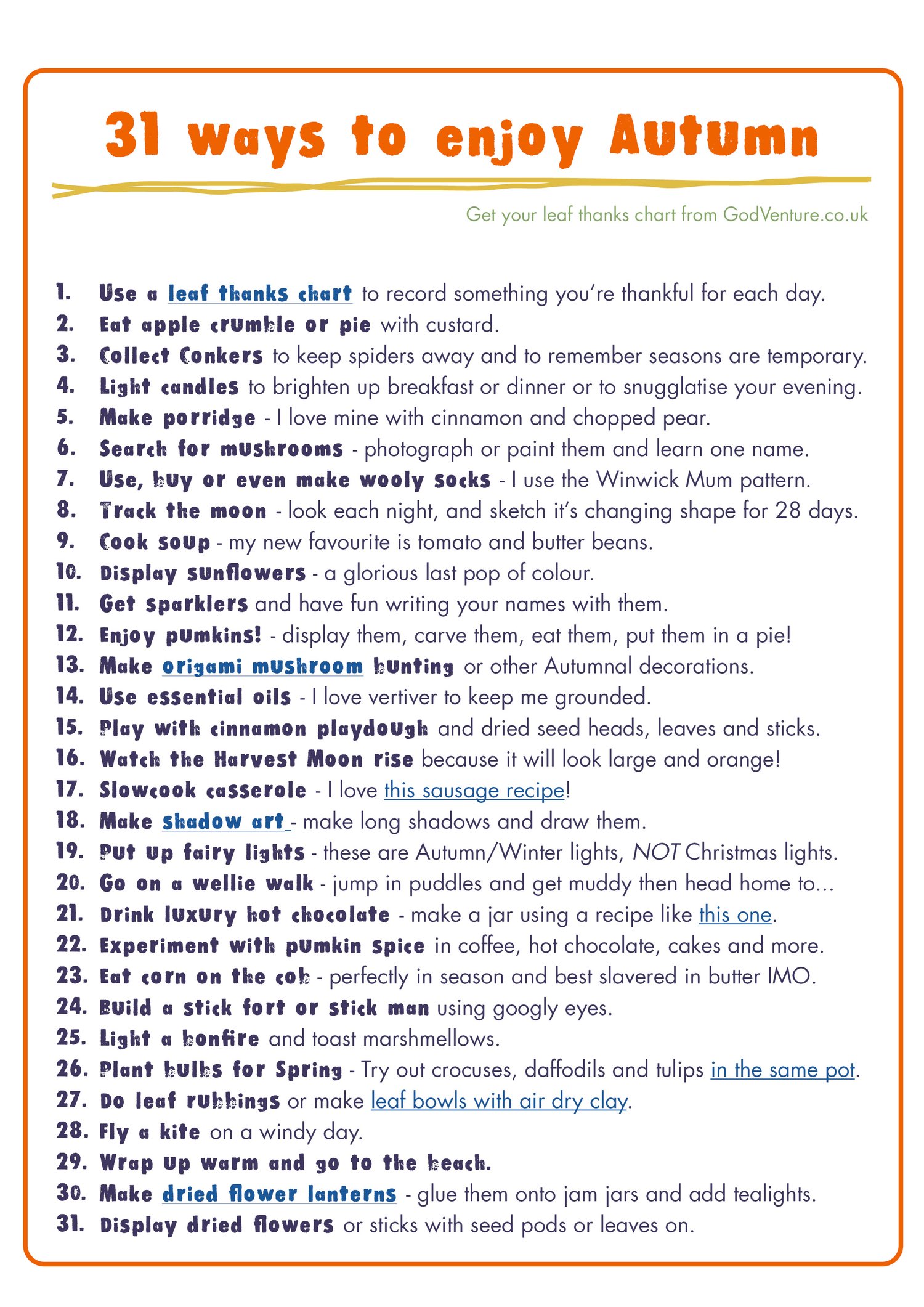 A list of simple pleasures to enjoy over the Autumn season. Not a To Do List, but a Could Do list ;-)
